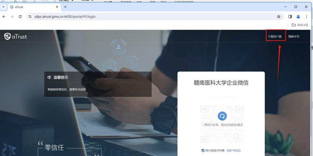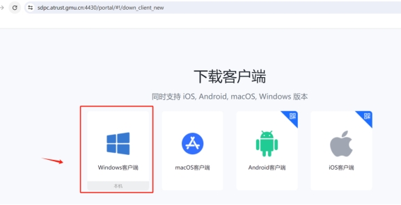 1.打开浏览器登陆 https://sdpc.atrust.gmu.cn:4430,右上角点击“下载客户端”下载客户端: