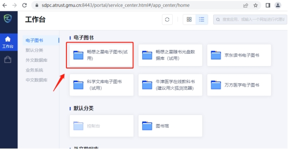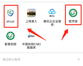 2.选择应用中的“atrust”或“图书馆”,如有登录或扫码的提醒则按要求操作,之后可访问需要的资源,如无资源可以联系信网中心添加相应的权限访问。