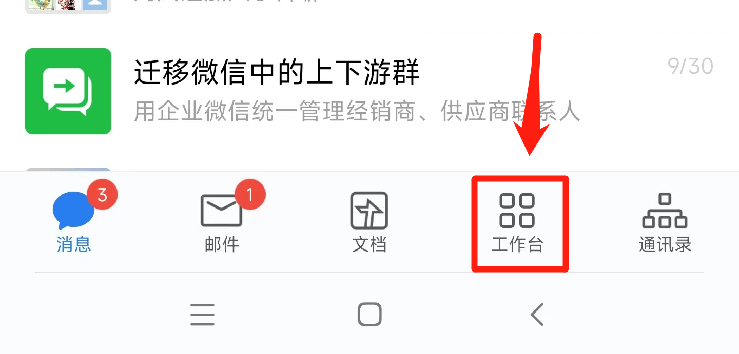 1.同第一部分操作步骤,手机端登录企业微信,选择工作台选项夹
